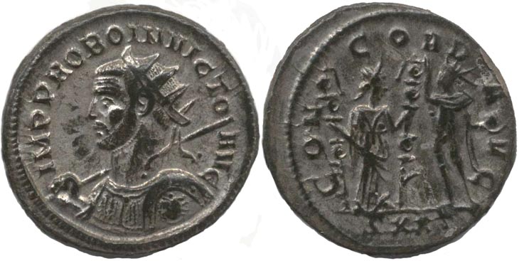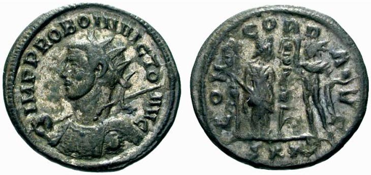Radiate, cuirassed bust left, with spear and shield. REV.: CONCORD AVG Concordia standing right, holding two ensigns and facing Sol standing left, Mintmark: // SXXT Weight: 3.95 g. Image provided courtesy of Philippe Gysen |